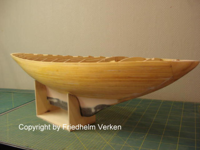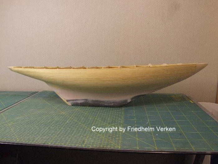 Der Übergang zum geschraubten Kiel wurde mit Feinspachtel angeglichen, danach wurde der gesamte Rumpf geschliffen. Um die Wendigkeit der Famara zu
