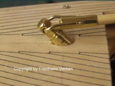 Niederholer für den Großbaum. Die gedrehten Messing Ringe und -Ösen wurden mit den Anbauteilen “ Hart “ verlötet, damit nach dem Schleifen und Polieren keine