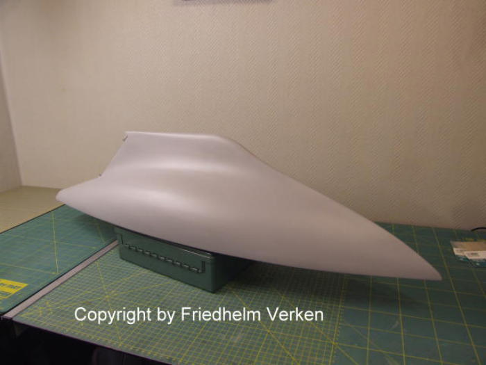 ganz kleinen Unebenheiten erkennen und ausbessern. Der Rumpf wurde zuerst ganz weiß glänzend lackiert. Für das Unterwasserschiff hatte ich die Farbe Karminrot