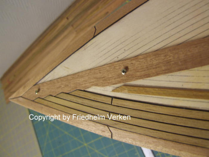 Vierkantleisten verarbeitet. Die Randbeplankung wurde aus Mahagoni-Furnier hergestellt, und später sieben mal mit klarem Bootslack versiegelt. Mit den Leisten