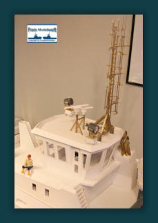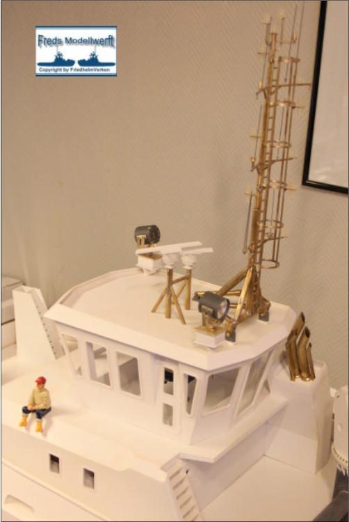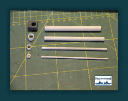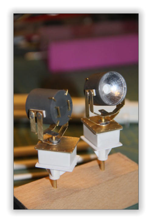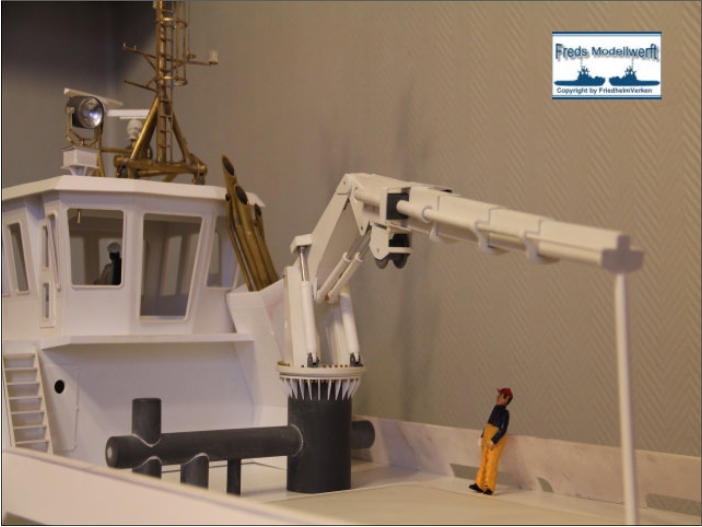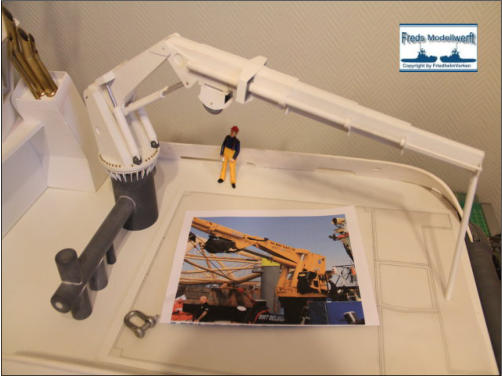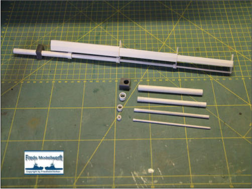 Die Einzelteile für die Ausleger - Hydraulikdämpfer habe ich ausPVC Röhrchen hergestellt und an den Enden um ca. 5 mm breiteund 0,5 mm dicke, für den jeweiligen “vorigen” Innendurchmesser,aufgedickt. Dazu habe ich einfach ein Stück Rohr aufgeklebtund es dann auf den passenden Durchmesser dünner gedreht. Die PVC Ringe sind bis auf den Letzten nur für die Optik. Der letzte Ring hat innen einen Ansatz damit das Teilstück nicht herausfällt. Die Kranrolle und Halterung habe ich nach Original Fotos angefertigt, denn auch sie unterscheidet sich von der Smit Bronco. Die beiden Seematz Scheinwerfer sind Bausätze der Firma Graupner, die ich etwas verändern musste um an dieOriginal Optik der Beluga Scheinwerfer zu kommen. So habe ich den Lampenkorpus und den -fuss erneuert. Zusätzlich habeich auf dem weißen Reflektor Silberfolie aufgeklebt.