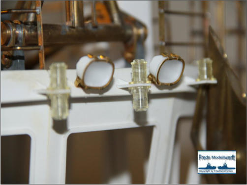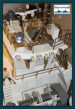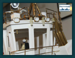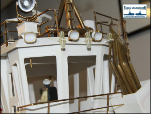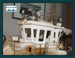 Das Arbeitsdeck wurde mit 139...! 5 x 1 mm Ahornleisten beplankt. Um hässliche Klebefleckenzu vermeiden habe ich die Leisten vorher von beiden Seiten mit mattem klaren Lack bestrichen.Die Bug und Heckstrahler sowie die Schlepplichtersind Fertigteile aus dem Hause “Modellbau Kaufhaus”Die beiden Türen in den Innenseiten der Stoßhörner habe ich wie üblich aus Polystyrol zurecht geschnitten, aufeinander geklebt und mit Scharnieren und Luken Griffeaus Messing bestückt.