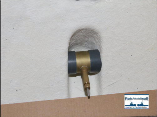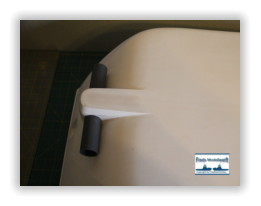 Mit einem 32 mm Forstnerbohrer habe ich die beiden Bohrungen für das Querstrahlruder in den Rumpf eingebracht. Da die Gesamtbreite des Querstrahlruders