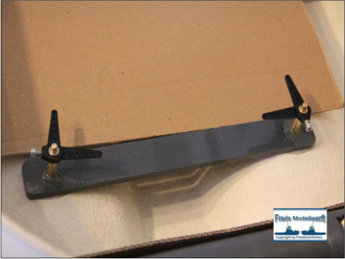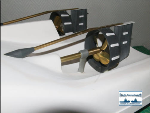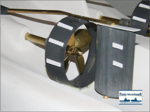dann mit den Bohrungen für die Befestigung der Kortdüse und Ruder bestückt habe. Die beiden Ruder habe ich aus 6 mm PVC ausgesägt und dann mit einem